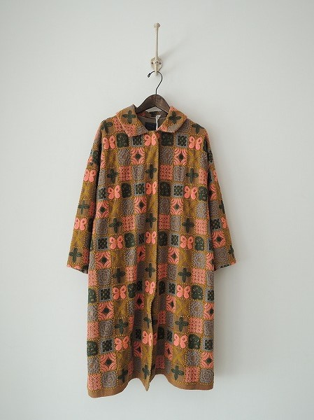 デザイン:mina perhonenの「forest tile」の刺繍コートです。カラーはブラウンのメッシュ地に、オレンジピンク×グレーマスタード×ダークグリーンなどの刺繍があしらわれています。フロントは内マグネットボタンで、裏地付きです。 (掲載写真は、実商品のカラーにできるだけ近づけるよう努力はしておりますが、お使いのモニターや画面設定等によっては、色が異なって見える場合もございますので、予めご了承下さい)