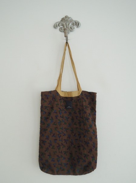 デザイン:mina perhonenのpuffinシリーズのトートバッグです。カラーはダークブラウンベースに濃い緑・青・紫・こげ茶で刺繍が施された、やや薄手の素材であしらわれています。持ち手部分は濃いベージュのグロングランテープで、素材は毛53%、麻47%です。