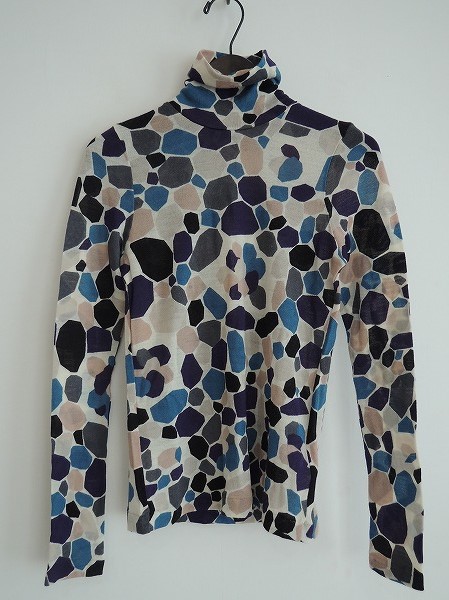 デザイン:mina perhonen「mosaic」のニットカットソーです。カラーはライトベージュベースに、黒×紫×グレー×ターコイズブルーなどの総柄で、やや透け感のあるニット素材であしらわれております。定価16,800円です。 (掲載写真は、実商品のカラーにできるだけ近づけるよう努力はしておりますが、お使いのモニターや画面設定等によっては、色が異なって見える場合もございますので、予めご了承下さい)