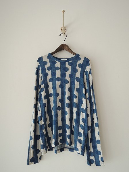 デザイン:mina perhonenの「friend」のニットカットソーです。カラーはミックスグレーベージュベースに、ブルー系のドット&ストライプの総柄プリントで、薄めのニット素材です。(掲載写真は、実商品のカラーにできるだけ近づけるよう努力はしておりますが、お使いのモニターや画面設定等によっては、色が異なって見える場合もございますので、予めご了承下さい)