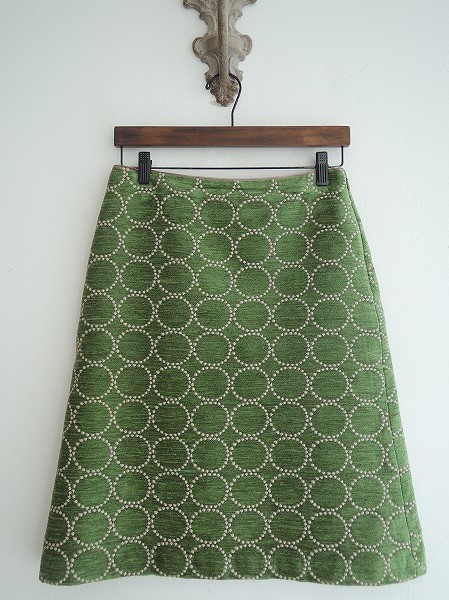 デザイン:mina perhonenの「tambourine」の刺繍スカートです。カラーはグリーン系で、別珍のよな生地にライトベージュの刺繍が施されております。左腰のファスナーで着脱し、裏地付きです。(掲載写真は、実商品のカラーにできるだけ近づけるよう努力はしておりますが、お使いのモニターや画面設定等によっては、色が異なって見える場合もございますので、予めご了承下さい)