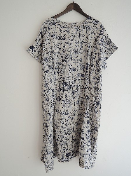 デザイン:mina perhonen「letter of flower」の総柄ワンピースです。カラーはライトグレーベージュの薄手のストライプ織り生地ベースに、ネイビーの総柄プリントです。バックネックのループボタンで着脱し、前後ウエストにはタックが施され、裏地はございません。(掲載写真は、実商品のカラーにできるだけ近づけるよう努力はしておりますが、お使いのモニターや画面設定等によっては、色が異なって見える場合もございますので、予めご了承下さい)