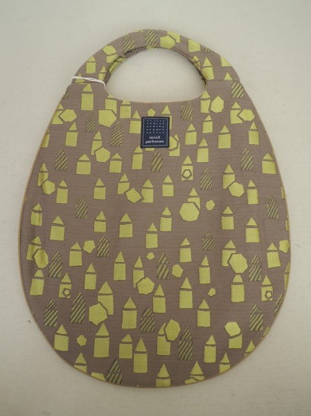 デザイン:mina perhonenのsnowシリーズのエッグバッグです。カラーはベージュブラウンベースに、やや光沢のある黄緑で刺繍があしらわれ、濃いベージュの合皮でパイピングが施されています。内側はベージュ系の裏地で、素材は表生地が毛39%、プロミックス28%、カシミヤ17%、絹16% 裏生地がポリエステル100%です。