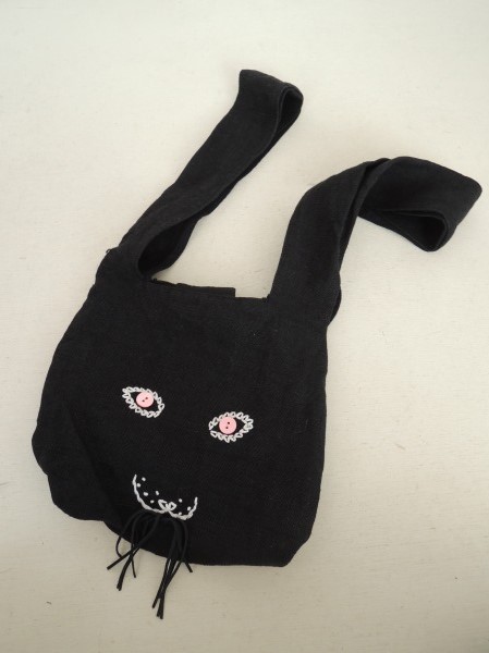 デザイン::mina perhonenのusa bagシリーズのうさバッグ小です。カラーはブラックで、フロントにはライトベージュの刺繍&ピンクの貝ボタンの目、ブラックのフリンジのひげが施されております。内にはポケット1つあり、素材は麻100%です。