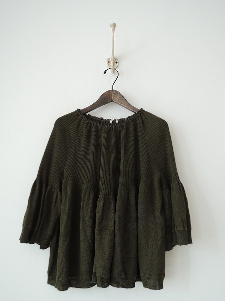 デザイン:mina perhonen 「ombrage」のニットプルオーバーです。カラーはモスグリーンで、全体に針抜きが施され、ネックにはゴム入りす。(掲載写真は、実商品のカラーにできるだけ近づけるよう努力はしておりますが、お使いのモニターや画面設定等によっては、色が異なって見える場合もございますので、予めご了承下さい)