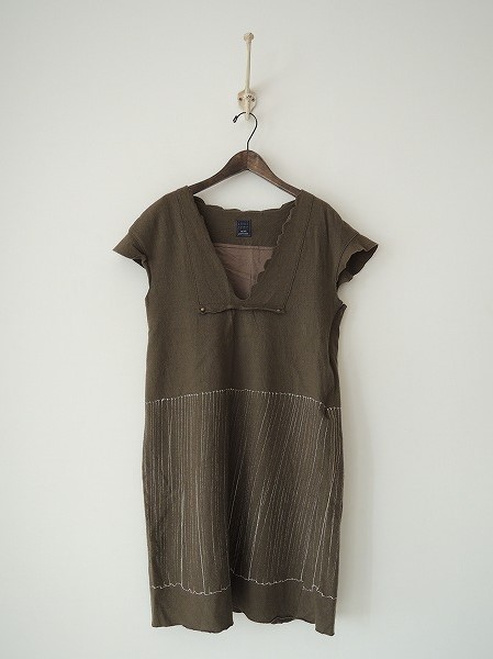 デザイン:mina perhonen 「pleats」のプリントワンピースです。カラーはブラウン系カーキで、「プリーツ」のフロッキープリントが施されております。左脇下ジッパーで着脱でき、衿繰りは波型カットされています。裏地付きです。(掲載写真は、実商品のカラーにできるだけ近づけるよう努力はしておりますが、お使いのモニターや画面設定等によっては、色が異なって見える場合もございますので、予めご了承下さい)