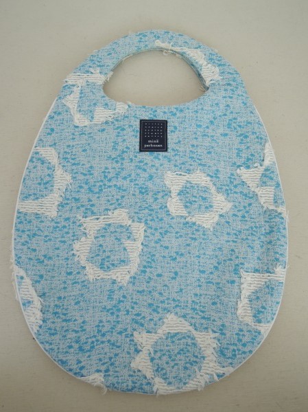 デザイン:mina perhonenのcieloシリーズのエッグバッグです。カラーはブルー系ベースに、オフホワイト紙で刺繍があしらわれ、ホワイトの合皮でパイピングが施されています。内側はホワイトの裏地で、素材は表生地が綿80%、指定外繊維(紙)20% 裏生地がポリエステル100%です。