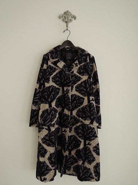 デザイン:mina perhonen 「fogland」のパイル総柄コートです。カラーはベージュベースにネイビー&グレーで、全面にパイル刺繍が施されています。左胸内側&両腰にはポケットがあり、ウエストには飾りベルトがあしらわれ、裏地付きです。 (掲載写真は、実商品のカラーにできるだけ近づけるよう努力はしておりますが、お使いのモニターや画面設定等によっては、色が異なって見える場合もございますので、予めご了承下さい)