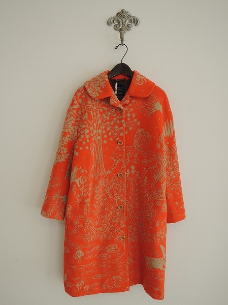 デザイン:mina perhonen 「imagine」の総柄コートです。カラーはオレンジベースにベージュの総柄で、フロントボタン開閉です。右内胸&両腰にはポケットがあり、裏地付きで、定価は136,500円です。 (掲載写真は、実商品のカラーにできるだけ近づけるよう努力はしておりますが、お使いのモニターや画面設定等によっては、色が異なって見える場合もございますので、予めご了承下さい)