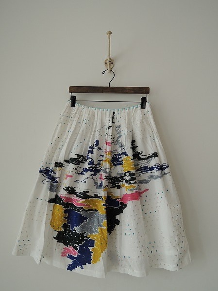 デザイン:mina perhonen 「mirage」の総柄スカートです。カラーはホワイトベースに、シルバー&ライトブルーのドット、カラフルで幻想的な手書き風のプリントがあしらわれております。左腰ファスナーで着脱し、ウエストにはタック&ステッチが施され、裏地付きです。定価は37,800円です。(掲載写真は、実商品のカラーにできるだけ近づけるよう努力はしておりますが、お使いのモニターや画面設定等によっては、色が異なって見える場合もございますので、予めご了承下さい)