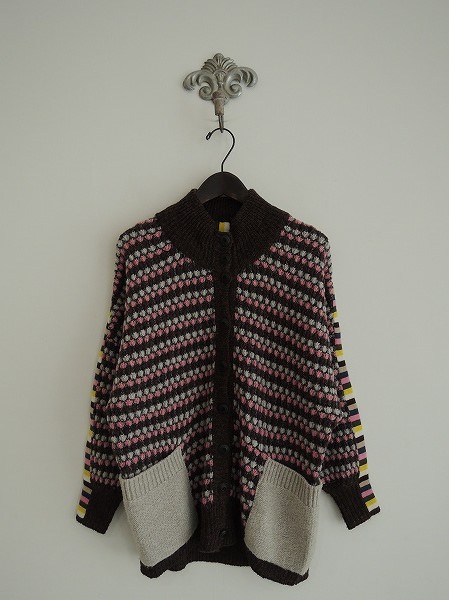デザイン:mina perhonen 「chipmunk」のカーディガンです。カラーはチャコールブラウン×ブラックのミックス・ピンク・ライトグレー・ブラックのニットであしらわれており、袖丈は上部はカラフルなボーダー織の薄手ニットに切替られております。 (掲載写真は、実商品のカラーにできるだけ近づけるよう努力はしておりますが、お使いのモニターや画面設定等によっては、色が異なって見える場合もございますので、予めご了承下さい)