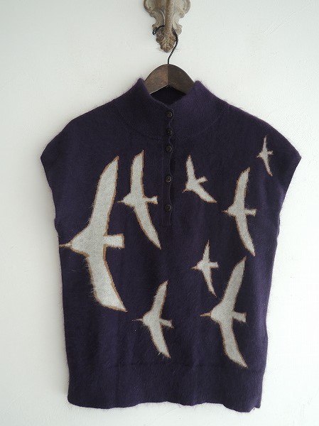デザイン:mina perhonen 「wataridori」のアンゴラニットです。カラーはダークパープルベースに、ブラウン×ライトグレーミックスで渡り鳥が施され、フロントは半開ボタンです(掲載写真は、実商品のカラーにできるだけ近づけるよう努力はしておりますが、お使いのモニターや画面設定等によっては、色が異なって見える場合もございますので、予めご了承下さい)