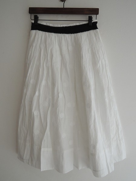 デザイン:mina perhonen 「vapor」の刺繍フレアスカートです。カラーはホワイトで、薄手生地の二枚仕立てであしらわれており、同カラーの刺繍入りです。ウエスト部はタック、ブラックのリボンが施されており、左腰のフック&ファスナーで着脱できます。(掲載写真は、実商品のカラーにできるだけ近づけるよう努力はしておりますが、お使いのモニターや画面設定等によっては、色が異なって見える場合もございますので、予めご了承下さい)