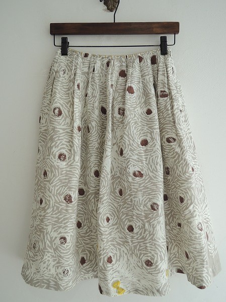 デザイン:mina perhonen 「papillon」のリネンプリントスカートです。ベースカラーはグレーベージュ×ホワイトで、ブラウン&イエローのプリントがあしらわれています。ウエストにはタックやステッチが施され、左腰のフック&ファスナーで着脱でき、裏地付きです。(掲載写真は、実商品のカラーにできるだけ近づけるよう努力はしておりますが、お使いのモニターや画面設定等によっては、色が異なって見える場合もございますので、予めご了承下さい)