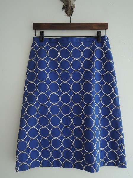 デザイン:mina perhonen 「tambourine」の刺繍スカートです。カラーはブルー系で、ライトベージュで全体に刺繍があしらわれています。左サイドのボタンとファスナーで着脱でき、裏地付きです。(掲載写真は、実商品のカラーにできるだけ近づけるよう努力はしておりますが、お使いのモニターや画面設定等によっては、色が異なって見える場合もございますので、予めご了承下さい)