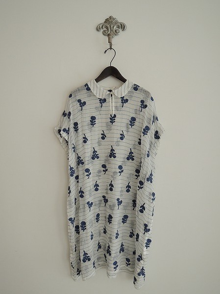 デザイン:mina perhonen 「bonheur」の刺繍ワンピースです。カラーはオフホワイト×くすんだブルーのボーダー織りの透け感のあるガーゼ地ベースに、ネイビーブルーで花の刺繍が施されております。フロントにはループボタンが1つあり、褪せ感のあるライトブルーの腰ひも付きで、裏地はございません。定価は58,800円です。(掲載写真は、実商品のカラーにできるだけ近づけるよう努力はしておりますが、お使いのモニターや画面設定等によっては、色が異なって見える場合もございますので、予めご了承下さい)