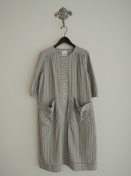 デザイン:ミナペルホネンランドリー 「turku」のストライプワンピースです。カラーはライトグレー×くすんだブルーで、フロントは半開ボタンです。両腰にはポケットがあり、ウエストには飾りベルトが施されています。(掲載写真は、実商品のカラーにできるだけ近づけるよう努力はしておりますが、お使いのモニターや画面設定等によっては、色が異なって見える場合もございますので、予めご了承下さい)
