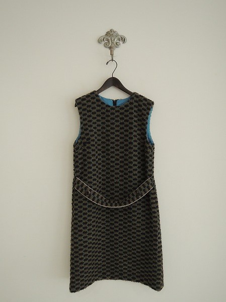 デザイン:mina perhonen「pave」の刺繍ワンピースです。カラーはグリーン系のライトカーキ×ダークグレーで、ループ状の生地の格子柄&光沢のあるサックスの刺繍ラインが入っております。バックファスナーで着脱でき、フロントには飾りベルトが施され、裏地付きです。(掲載写真は、実商品のカラーにできるだけ近づけるよう努力はしておりますが、お使いのモニターや画面設定等によっては、色が異なって見える場合もございますので、予めご了承下さい)