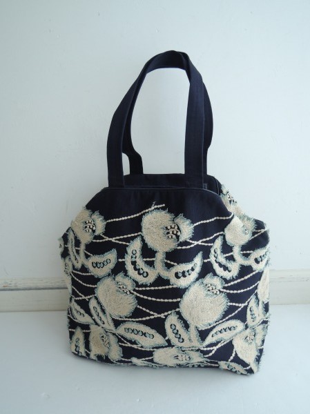 デザイン:mina perhonen 「wind flower」のカヌレバッグです。カラーは濃紺ベースに、ベージュ×くすみがかったライトブルーの刺繍が施されており、開口部は蓋カバー付きのマグホック仕様です。内側は濃紺の裏地で、ポケットが1つ付いております。素材は表生地が綿100% 刺繍部分が綿100% 裏生地が麻100%です。