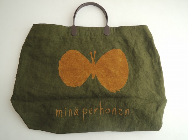 デザイン:mina perhonen 「choucho」のsampoバッグです。カラーはグリーン系カーキで、フロントにはブラウンで蝶やブランド名のフロッキープリントが施されています。開口部は巾着タイプで、ポケットが内に1つあり、持ち手部分はダークブラウンでプラスチック素材です。素材は麻100%です。