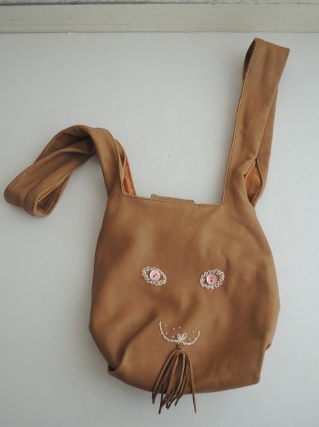 デザイン:mina perhonenのusa bagシリーズのうさバッグ小です。カラーは濃いベージュで、柔らかなレザーです。ピンクのボタン、オフホワイトの刺繍、濃いベージュの革紐で、うさぎさんのお顔がデザインされています。持ち手は耳の様にあしらわれており、内側にはライトブラウンの裏地と、ポケットが1つ付いています。素材は表が牛革 裏が麻100%で、定価は35,700円です。