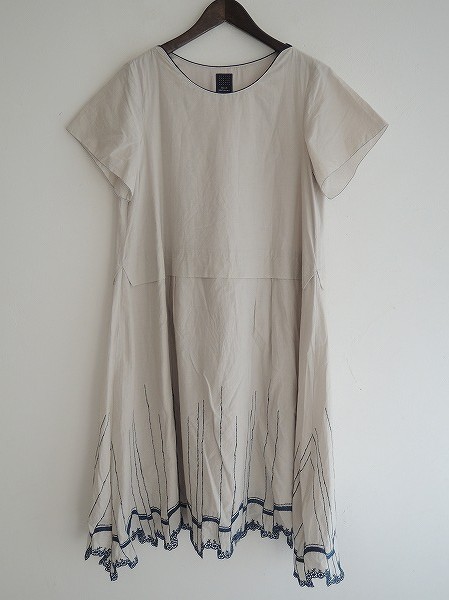 デザイン:mina perhonen 「waltz」の刺繍ワンピースです。カラーはうすいベージュで、裾にはネイビーブルーのカットワーク刺繍が施されております。ウエスト辺りで切り替えられフロントのみタックが入っています。身頃&スカート部には裏地付きです。(掲載写真は、実商品のカラーにできるだけ近づけるよう努力はしておりますが、お使いのモニターや画面設定等によっては、色が異なって見える場合もございますので、予めご了承下さい)