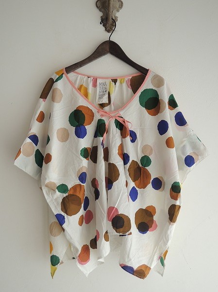 デザイン:ミナぺルホネンランドリー「rain star」のオーバーブラウスです。カラーはホワイト×ブラウン系、青、緑、ピンクなどで、少し透け感のある薄手平織り生地です。フロントのヒモは取り外し不可で、袖口はヘムステッチであしらわれております。裾サイドのスリットは14.5cm程ございます。 (掲載写真は、実商品のカラーにできるだけ近づけるよう努力はしておりますが、お使いのモニターや画面設定等によっては、色が異なって見える場合もございますので、予めご了承下さい)