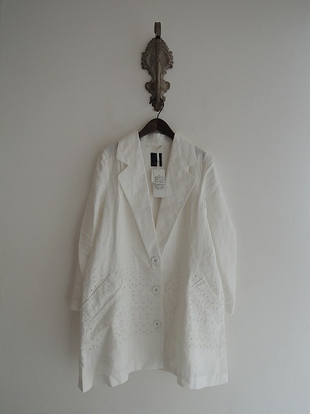 デザイン:2014年春夏コレクション mina perhonenの「sun moss」のジャケットです。カラーはホワイトで、カットワーク刺繍が施された薄手の素材です。フロントボタン開閉で、腰両サイドにはポケットがあります。定価は税抜58,000円です。 (掲載写真は、実商品のカラーにできるだけ近づけるよう努力はしておりますが、お使いのモニターや画面設定等によっては、色が異なって見える場合もございますので、予めご了承下さい)