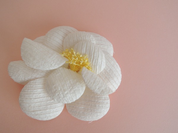 デザイン:mina perhonenのpetalシリーズのコサージュです。カラーはホワイトで、中央部分にはライトイエローの軸があしらわれたデザインで、張りのある肌触りです。