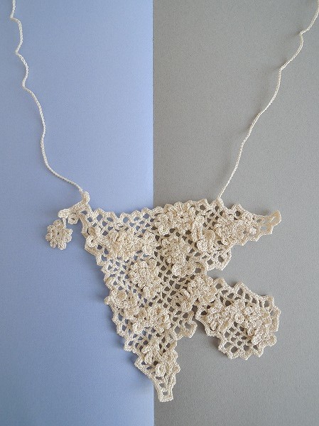 デザイン:mina perhonenのodysseyシリーズの刺繍ネックレスです。カラーはベージュで、ネックレストップにはお花をあしらった鳥のモチーフが施され、ひもを結ぶタイプなので長さの調節が可能です。定価は14,700円です。