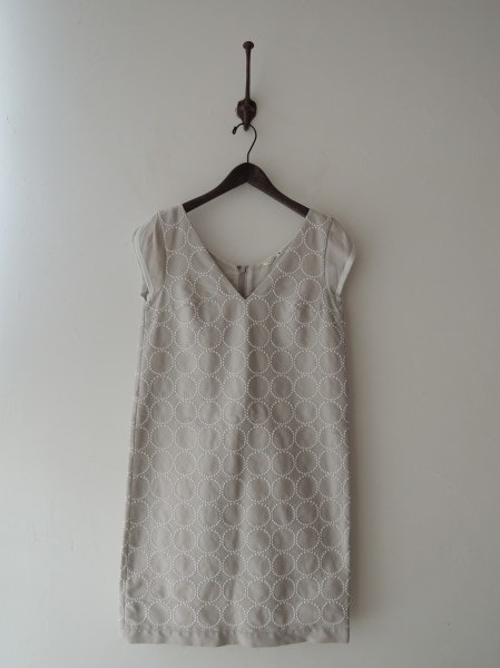 デザイン:mina perhonenの「tambourine」の刺繍ワンピースです。カラーはベージュがかったグレーベースに、ホワイトの刺繍が全面にあしらわています。アームホールにはホワイトでパイピングが施され、ウエストにはベルトループがあります。バックファスナーで着脱し、裏地付きです。(掲載写真は、実商品のカラーにできるだけ近づけるよう努力はしておりますが、お使いのモニターや画面設定等によっては、色が異なって見える場合もございますので、予めご了承下さい)