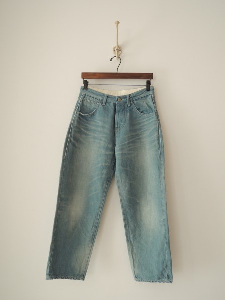 デザイン:mina perhonen 「always」の綿麻デニムパンツです。カラーはインディゴ染めのライトブルー、フロントはボタンフライで、5ポケットです。ユーズド・ダメージ加工などが施されており、ウエスト部分裏側とポケット内袋は「mermaid」の刺繍柄になっております。(掲載写真は、実商品のカラーにできるだけ近づけるよう努力はしておりますが、お使いのモニターや画面設定等によっては、色が異なって見える場合もございますので、予めご了承下さい)