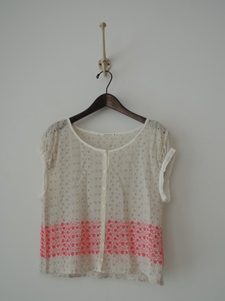 デザイン:mina perhonen 「sun moss」のシルクブラウスです。カラーはライトベージュのシフォン地ベースに、ライトベージュ&光沢のあるピンクのカットワーク刺繍が全面に施されております。フロントボタン開閉で着脱でき、カットワーク部からはインが見えるデザインで、裏地は付いておりません。(掲載写真は、実商品のカラーにできるだけ近づけるよう努力はしておりますが、お使いのモニターや画面設定等によっては、色が異なって見える場合もございますので、予めご了承下さい)