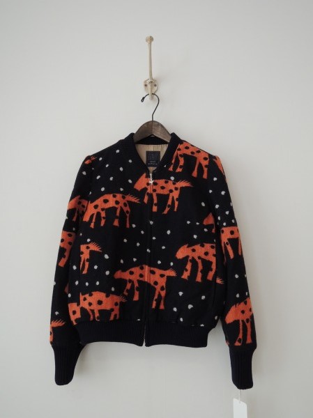 デザイン:mina perhonenの「caravan」のジャケットです。カラーは濃紺地にオレンジ×オフホワイトで、雪を表したドット模様とノルマンディ牛が描かれたデザインです。フロントはジッパー開閉で、両腰にはポケットがあり、襟ぐり&袖口はリブ使いで、裏地付きです。定価(税抜)46,000円です。 (掲載写真は、実商品のカラーにできるだけ近づけるよう努力はしておりますが、お使いのモニターや画面設定等によっては、色が異なって見える場合もございますので、予めご了承下さい)