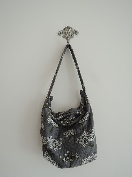 デザイン:mina perhonenのbloomシリーズのボディバッグ大です。カラーはグレー地にライトグレー・グリーン系カーキでお花刺繍とステッチが施されたデザインで、開口部はファスナーです。内側にはこげ茶の裏地とポケットが1つ付いており、素材は表生地がアクリル53%・綿47%、裏生地が綿100%です。