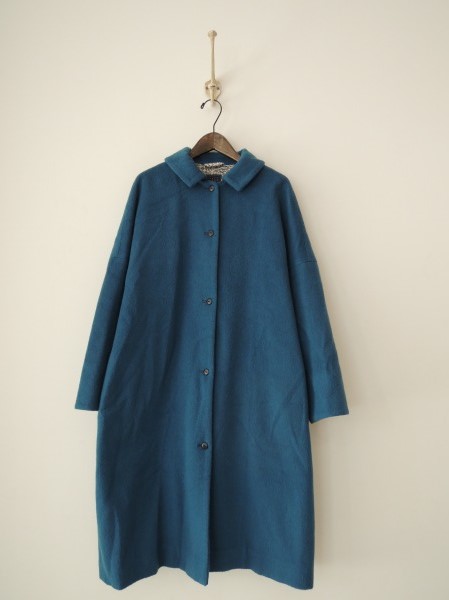 デザイン:mina perhonen 「largo」のカシミヤコートです。カラーはターコイズブルーで、柔らかな手触りの素材であしらわれており、裏地は「sleeping rose」のテキスタイルになっています。フロントはボタン開閉で、腰両サイドにはシームポケットがあり、後ろウエストの飾りベルトはボタンで取り外し可能です。定価115,500円です。 (掲載写真は、実商品のカラーにできるだけ近づけるよう努力はしておりますが、お使いのモニターや画面設定等によっては、色が異なって見える場合もございますので、予めご了承下さい)