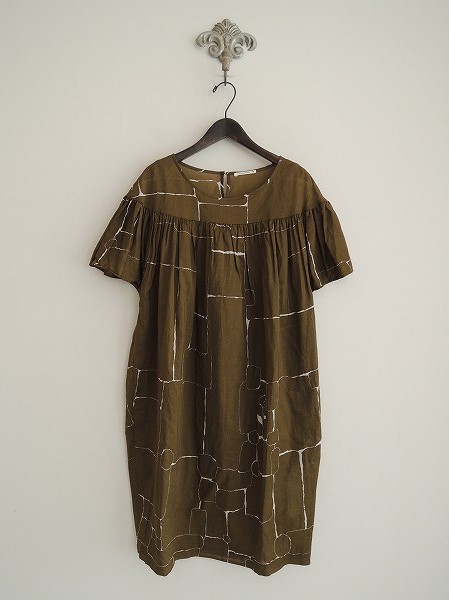 デザイン::mina perhonen 「undiscovered」のワンピースです。カラーはブラウン系カーキ×ホワイトで、プリント入りの薄手生地であしらわれております。バックボタンで着脱し、裏地はございません。(掲載写真は、実商品のカラーにできるだけ近づけるよう努力はしておりますが、お使いのモニターや画面設定等によっては、色が異なって見える場合もございますので、予めご了承下さい)