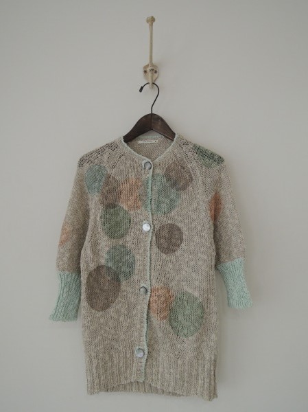 デザイン:mina perhonen 「shabondama」の五分袖ニットカーディガンです。カラーは光沢のあるライトグレー系のやや薄手のミックスニットに、淡いカラーのグリーン・ピンク・ブルー・グレーのドット柄の顔料プリントが施されております。ボタン開閉です。 (掲載写真は、実商品のカラーにできるだけ近づけるよう努力はしておりますが、お使いのモニターや画面設定等によっては、色が異なって見える場合もございますので、予めご了承下さい)