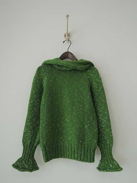 デザイン:mina perhonen 「Rovaniemi」のマフラー付きニットです。カラーはグリーンで、ホワイトのネップ入りの厚手ニットであしらわれております。フード&ポンポン付きのマフラー付きのデザインで、袖口は少しフレアなシルエットになっております。(掲載写真は、実商品のカラーにできるだけ近づけるよう努力はしておりますが、お使いのモニターや画面設定等によっては、色が異なって見える場合もございますので、予めご了承下さい)