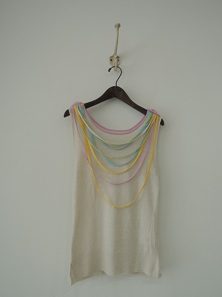 デザイン:mina perhonenの「happy rainbow」のノースリニットです。カラーはライトベージュで、薄手ニットであしらわれており、襟元はパステル系カラーのニットひもがあしらわれております。両裾に6cmのスリット入りで、定価30,450円の商品です。(掲載写真は、実商品のカラーにできるだけ近づけるよう努力はしておりますが、お使いのモニターや画面設定等によっては、色が異なって見える場合もございますので、予めご了承下さい)