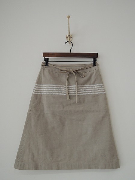 デザイン:mina perhonenの「boulanger」の刺繍スカートです。カラーはグレーベージュベースにオフホワイトでボーダー状の刺繍が施されています。左腰ファスナー&腰ひもを結び着用し、裏地付きです。(掲載写真は、実商品のカラーにできるだけ近づけるよう努力はしておりますが、お使いのモニターや画面設定等によっては、色が異なって見える場合もございますので、予めご了承下さい)