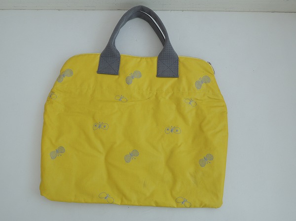 デザイン:mina perhonenのchouchoシリーズの手提げバッグです。カラーは鮮やかなイエロー地にライトグレーで蝶々の刺繍があしらわれたデザインで、表面はPVCコーティングが施されています。持ち手はグレーで、開口部はファスナーです。内側にはライトグレーの裏地とポケットが2つ付いており、素材は基布・刺繍糸・裏生地共に綿100%です。