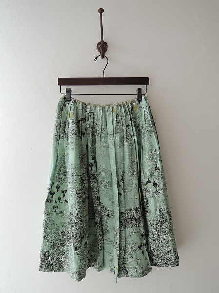 デザイン:mina perhonen 「spray」の総柄スカートです。カラーは少しくすんだミントグリーンベースにブラウングレー×山吹の総柄プリントで、ウエストには黄土の糸でステッチが施されています。左腰ファスナーで着脱し、裏地付きです。定価39,900円です。 (掲載写真は、実商品のカラーにできるだけ近づけるよう努力はしておりますが、お使いのモニターや画面設定等によっては、色が異なって見える場合もございますので、予めご了承下さい)