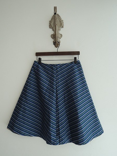 デザイン:mina perhonen 「wavelet」のフレアスカートです。カラーはネイビー・深緑・濃ブルー・くすんだブルー系で、色ごとにタックになった生地であしらわれています。バックセンターのフック&ファスナー着脱で、裏地付きです。定価54,600円の商品です。 (掲載写真は、実商品のカラーにできるだけ近づけるよう努力はしておりますが、お使いのモニターや画面設定等によっては、色が異なって見える場合もございますので、予めご了承下さい)