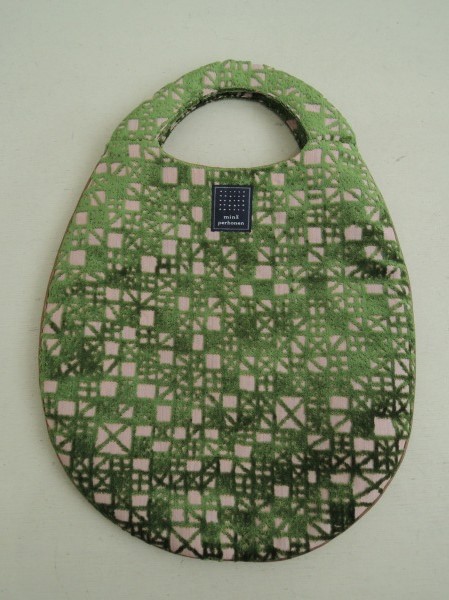 デザイン:2014年SSコレクション mina perhonenのmeriシリーズのエッグバッグです。カラーはベージュ地に艶のある明るいグリーンのパイル刺繍が一面に施されたデザインで、パイピング部分は薄ブラウンの合皮です。内側には光沢のあるくすんだ黄土色の裏地が付いており、素材は表生地ベースが麻100%・パイルがアクリル100%、裏生地がポリエステル100%です。