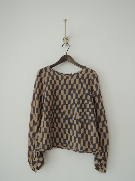 デザイン:mina perhonen 「sticky」のウール総柄ブラウスです。カラーはブラウンベージュ×濃いグレーの総柄プリントで、薄手の素材です。バックボタンで着脱できます。 (掲載写真は、実商品のカラーにできるだけ近づけるよう努力はしておりますが、お使いのモニターや画面設定等によっては、色が異なって見える場合もございますので、予めご了承下さい)
