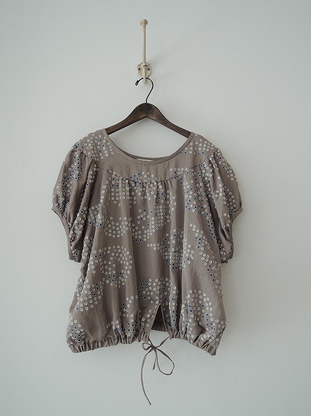デザイン:mina perhonenの「puff」のプルオーバーシャツです。カラーはブラウングレーで、光沢のある薄手生地であしらわれております。グレー×ブルー系のオパールプリントが施され、裾はゴム&ひも入りです。 (掲載写真は、実商品のカラーにできるだけ近づけるよう努力はしておりますが、お使いのモニターや画面設定等によっては、色が異なって見える場合もございますので、予めご了承下さい)