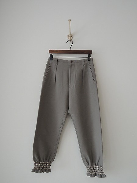デザイン:mina perhonen「rock」のクロップドパンツです。カラーはグレーで、フロントはボタン&ファスナーで着脱できます。前ウエストにタックがあしらわれ、裾にはゴムシャーリング刺繍が施されています。両腰&両ヒップにポケットがあり、定価は35,700円です。 (掲載写真は、実商品のカラーにできるだけ近づけるよう努力はしておりますが、お使いのモニターや画面設定等によっては、色が異なって見える場合もございますので、予めご了承下さい)