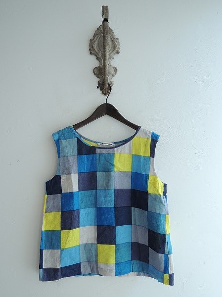 デザイン:2014年春夏コレクション mina perhonen 「jelly」のノースリーブプルオーバーです。カラーはイエロー×濃淡ネイビー×ブルー系などのプリントで、やや薄手の素材であしらわれております。定価は25,920円のお品です。 (掲載写真は、実商品のカラーにできるだけ近づけるよう努力はしておりますが、お使いのモニターや画面設定等によっては、色が異なって見える場合もございますので、予めご了承下さい)