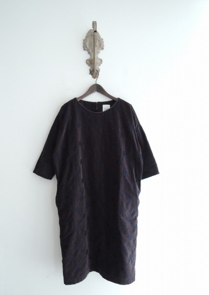 デザイン:ミナペルホネンランドリー 「vapor」のドットワンピースです。カラーはパープルがかったダークグレーネイビーで、コーデュロイ地のような起毛がかった薄手生地で、ネイビーのドット刺繍入りです。襟ぐりはパープルでパイピングが施されております。バックウエスト部分はゴム入りで、首にループボタンが付いています。両腰にポケットがございます。 (掲載写真は、実商品のカラーにできるだけ近づけるよう努力はしておりますが、お使いのモニターや画面設定等によっては、色が異なって見える場合もございますので、予めご了承下さい)